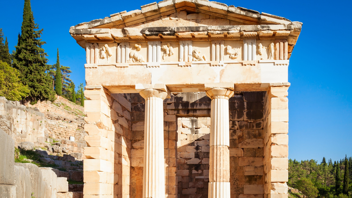 Secondo la mitologia greca, Delfi era considerata il centro del mondo. Si narra che Zeus, per determinare il punto esatto in cui la terra era connessa al cielo, lasciò volare due aquile da estremità opposte del mondo, e queste si incontrarono proprio a Delfi. In quel luogo fu posto uno “omphalos”, un simbolico ombelico del mondo, che sanciva la centralità della città nello spazio geografico e spirituale dei Greci. Delfi non era dunque solo un santuario, ma il punto di riferimento cosmico in cui gli uomini potevano comunicare con gli dèi e ricevere indicazioni divine.